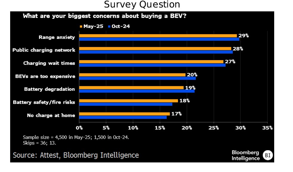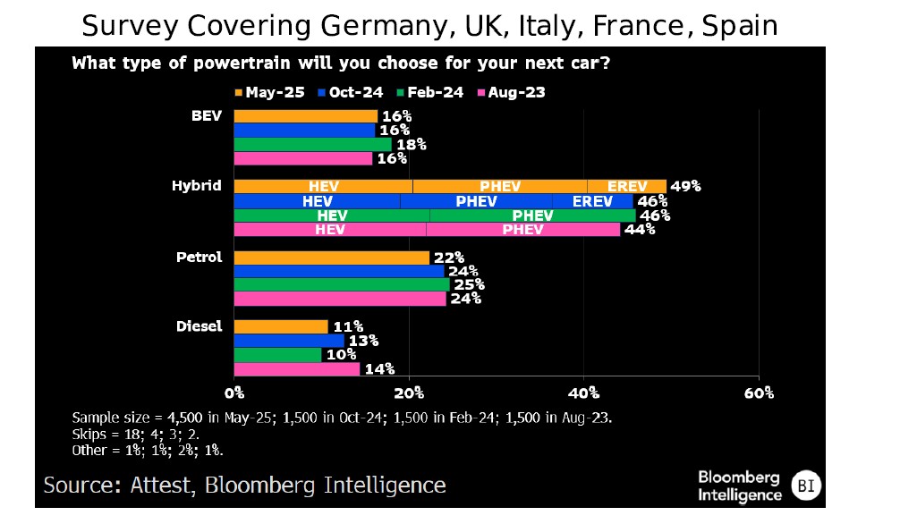 Eine aktuelle Umfrage von Bloomberg Intelligence zeigt, dass die Begeisterung für batterieelektrische Fahrzeuge (BEVs) in Europa nachlässt, da Hindernisse wie Ladeinfrastruktur, Reichweitenangst und hohe Preise bestehen bleiben. Nur 16% der europäischen Käufer planen, in den nächsten 12 Monaten ein BEV zu erwerben. Zudem stoßen chinesische Marken auf große Skepsis, denn 68% der Befragten zögern, ein chinesisches Modell zu kaufen. Währenddessen bleibt eine starke Markentreue zu etablierten Herstellern bestehen. Doch Hybridfahrzeuge, insbesondere HEVs, erfreuen sich weiterhin großer Beliebtheit. Ferner zeigt die Umfrage einen wachsenden Widerstand gegen das geplante Verbrenner-Verbot 2035, was wiederum Regulierungen beeinflussen könnte.