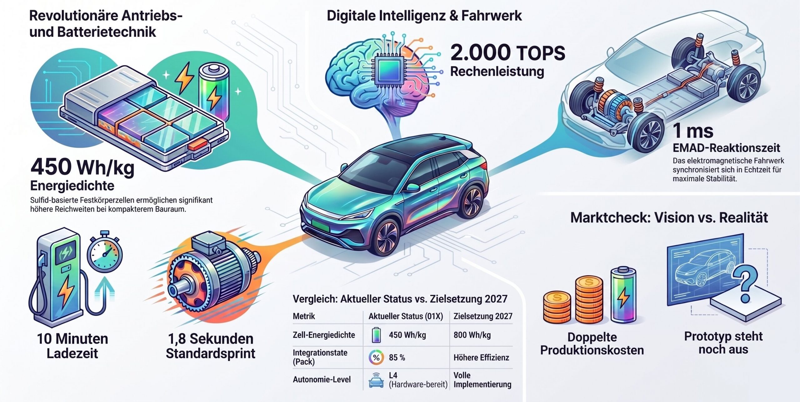 Der chinesische Technologiekonzern Dreame erweitert sein Portfolio um den Elektro-SUV Nebula Next 01X. Bislang war der Hersteller primär für seine Haushaltsrobotik und Hochgeschwindigkeitsmotoren bekannt. Das Fahrzeug soll als erster Premium-SUV mit einer seriell gefertigten Festkörperbatterie auf Sulfidbasis ausgestattet werden. Mit einer Energiedichte von 450 Wh/kg verspricht das Unternehmen eine signifikante Steigerung der Reichweite bei reduziertem Bauraum. Trotz beeindruckender Leistungsdaten von 1,8 Sekunden für den Standardsprint bleibt die Skepsis in der Branche weiterhin bestehen, weil fahrfähige Prototypen noch ausstehen und die Kosten für die Festkörperproduktion im Vergleich zu Lithium-Ionen-Akkus derzeit deutlich höher sind.