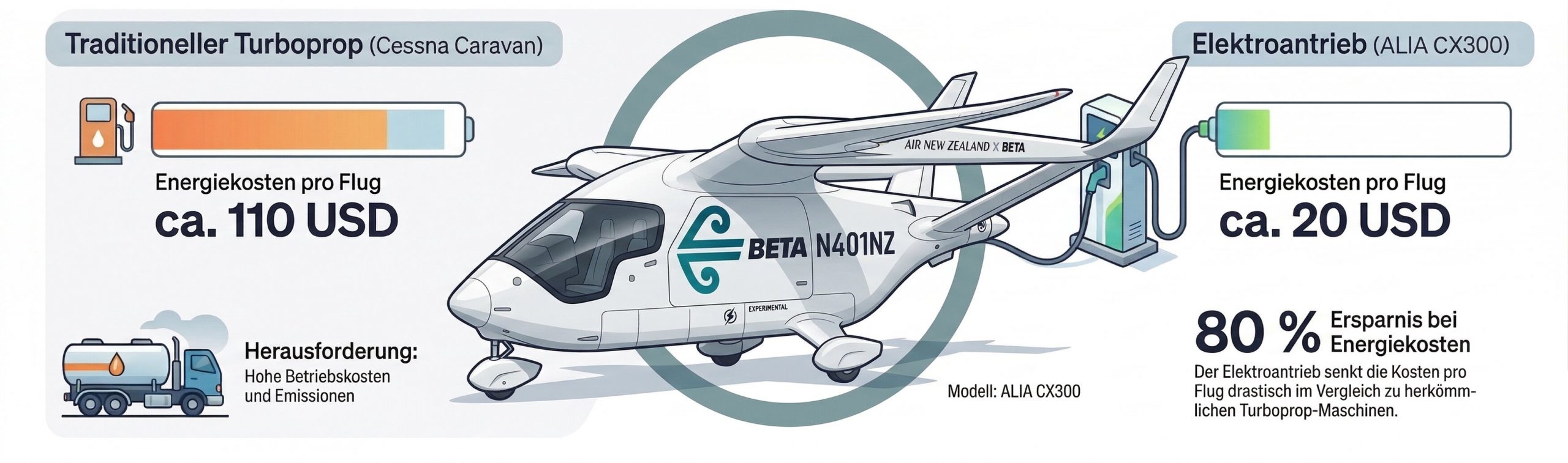 Die Auswertung der über 100 Testflüge lieferte deutliche Belege für die wirtschaftliche Überlegenheit des Elektroantriebs auf Kurzstrecken. Auf der Route zwischen Wellington und Blenheim wurden die Betriebskosten direkt verglichen. Dabei zeigte sich eine drastische Differenz. Während der Betrieb der konventionellen Cessna Caravan Energiekosten von rund 110 US-Dollar pro Flug verursachte, lagen die Kosten für die elektrische ALIA CX300 bei lediglich etwa 20 US-Dollar. Diese Ersparnis von rund 82% bei den direkten Energiekosten eröffnet somit neue Möglichkeiten für regionale Flugverbindungen, die mit herkömmlichen Kerosin-Flugzeugen bisher kaum wirtschaftlich zu betreiben waren.