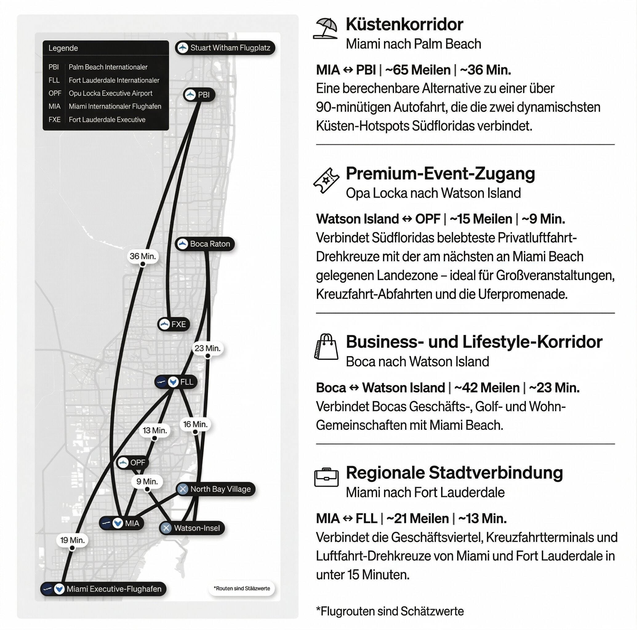 | Miami Intl. ↔ Palm Beach | 36 min | > 90 min | 65 Meilen (ca. 105 km) |
