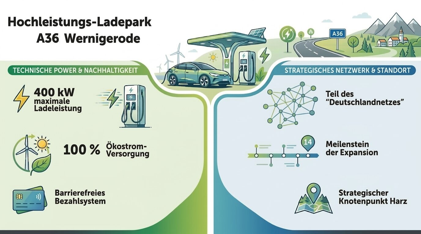 Der Ausbau der öffentlichen Ladeinfrastruktur entlang der deutschen Fernstraßen schreitet in Sachsen-Anhalt weiter voran. Auf dem Parkplatz Regensteinblick Süd an der Autobahn A36 bei Wernigerode nahm enercity nun den ersten Schnellladepark im Rahmen des sogenannten Deutschlandnetzes in Betrieb. Das Energieunternehmen aus Hannover ist als Partner der autostrom plus GmbH für die technische Umsetzung des Standorts in Fahrtrichtung Bernburg verantwortlich. Die neue Anlage stellt dabei einen wichtigen Knotenpunkt für den elektrischen Reiseverkehr auf der Harzautobahn dar und markiert gleichzeitig den ersten abgeschlossenen Standort innerhalb der Autobahn-Niederlassung Ost.