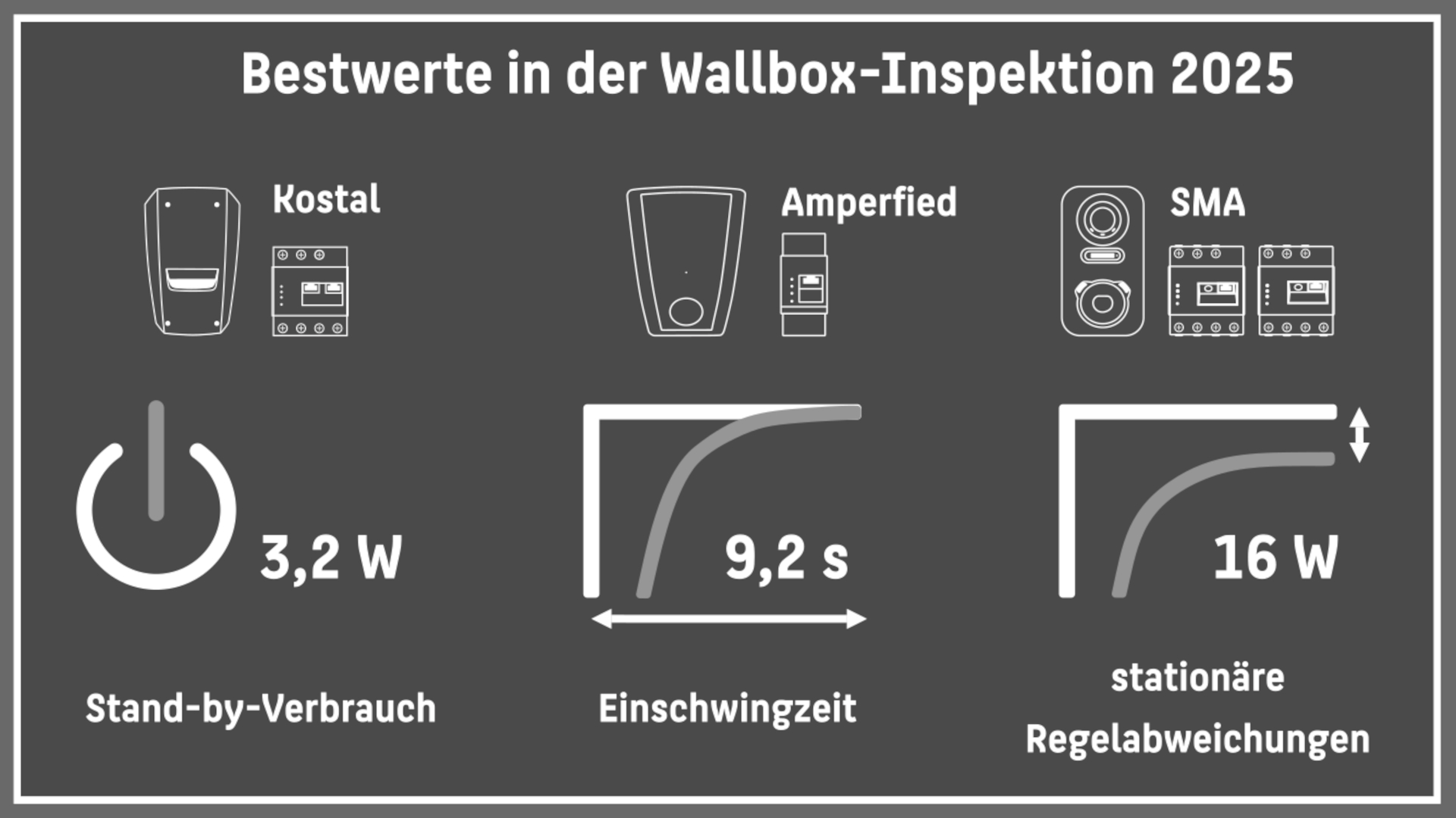 Die Labormessungen im Detail verdeutlichten, dass die Effizienz der Wallboxen, gemessen an der maximalen Nutzung des solaren Überschusses, von zwei zentralen, voneinander unabhängigen technischen Parametern abhängt. Diese sind die dynamische Regelgüte und die Eigenverluste im Bereitschaftsbetrieb. Dabei entscheidet die dynamische Regelgüte darüber, wie schnell und präzise die Wallbox auf kurzfristige Schwankungen der PV-Erzeugung oder der Haushaltslast reagieren kann. Dies ist essenziell, um einerseits den teuren Netzbezug zu vermeiden und andererseits keine wertvolle Solarenergie ungenutzt ins Netz einzuspeisen. Außerdem ist auch der zweite Faktor, die Minimierung der Eigenverluste (Stand-by-Verbrauch), ein kritischer Kostenfaktor, da die Wallboxen den Großteil des Jahres (>8.000 Stunden) inaktiv sind.