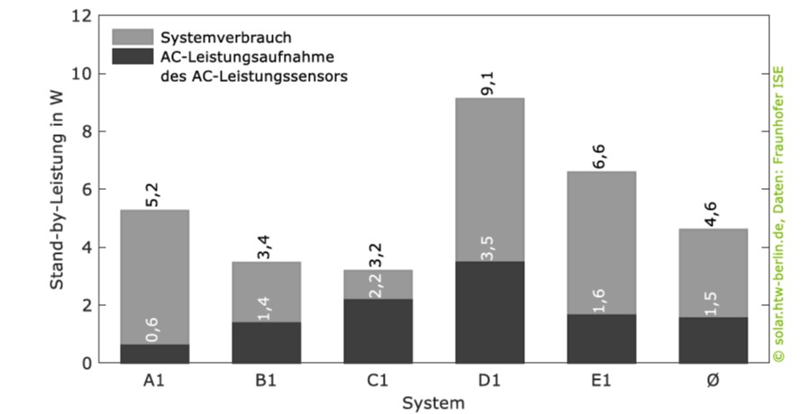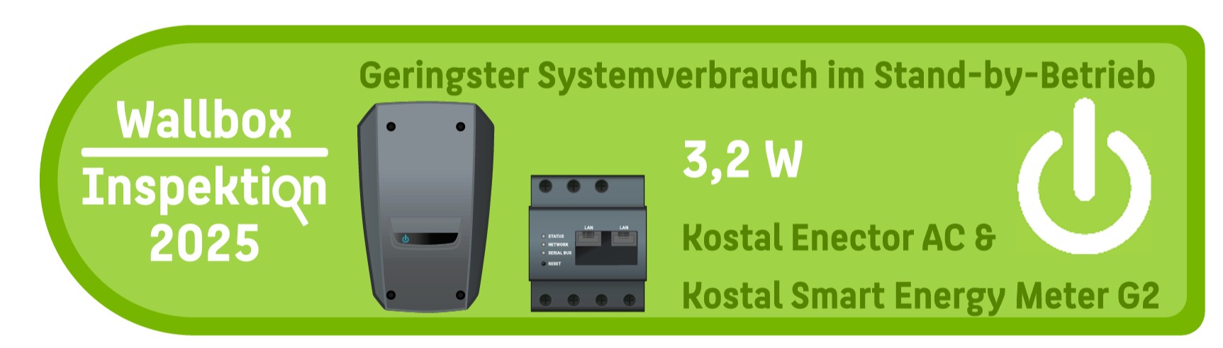 Das System von Kostal Enector AC (mit Smart Energy Meter G2) stach mit dem niedrigsten Eigenverbrauch hervor, denn es benötigte lediglich 3,2 Watt im Stand-by. Dies ist z.B. dreimal niedriger als beim verlustreichsten Gerät im Testfeld; das zeigte der direkte Vergleich der Medianwerte der Stand-by-Verbräuche. Kurzum: Dies entspricht einer jährlichen Reduzierung der Stand-by-Verluste um 50 Kilowattstunden und damit fast 12 Euro.