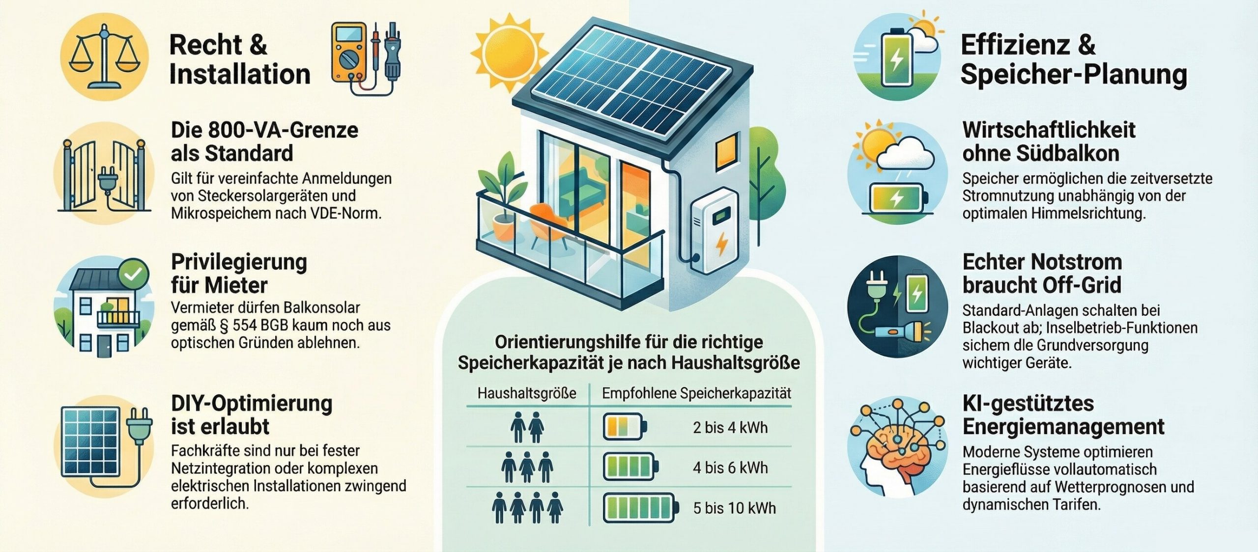 Ein weitverbreiteter Irrtum besagt, dass Anlagen über 800 Watt illegal seien. Tatsächlich betrifft dieser Wert lediglich die Grenze für das sogenannte „vereinfachte Anmeldeverfahren“ von Steckersolargeräten. Bis 800 VA Einspeisungsleistung können die Systeme unter erleichterten Vorgaben betrieben werden; mit der neuen Norm VDE-AR-N 4105:2026-03 werden nun auch Mikrospeicher bis 800 VA regulatorisch klassischen Balkonkraftwerken gleichgestellt. Leistungsstärkere Systeme sind weiterhin zulässig, unterliegen jedoch weitergehenden technischen Anforderungen an Planung und Netzanschluss durch Fachpersonal.