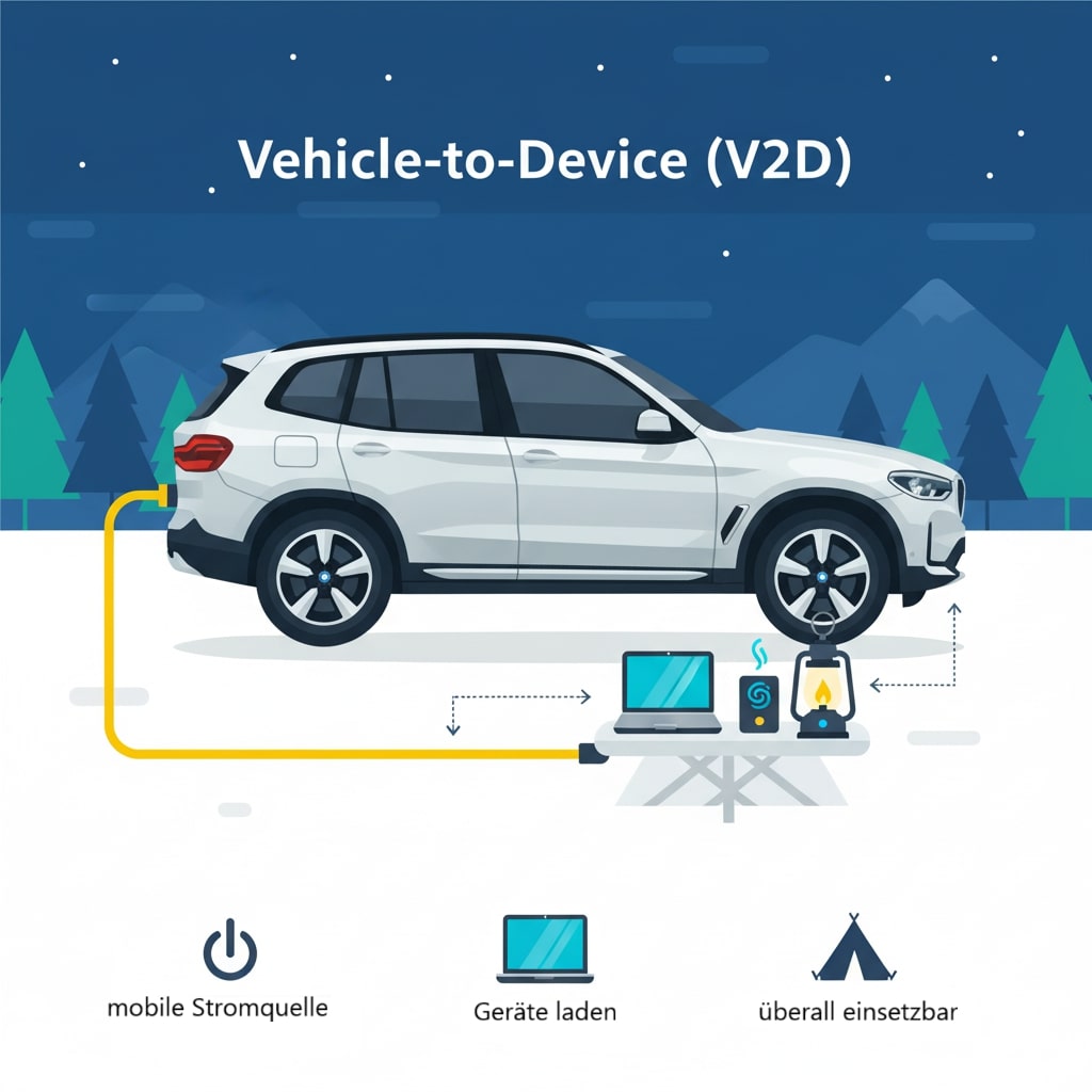 Vehicle-to-Device (V2D) oder auch Vehicle-to-Load (V2L): Das Elektroauto wird zur mobilen Powerbank und versorgt elektrische Geräte wie Laptops, Werkzeuge oder Haushaltsgeräte direkt über die Fahrzeugbatterie mit Strom. Ideal für den Einsatz fernab jeder Steckdose, zum Beispiel beim Camping. Diese Variante steht Besitzern von E-Autos bereits zur Verfügung.