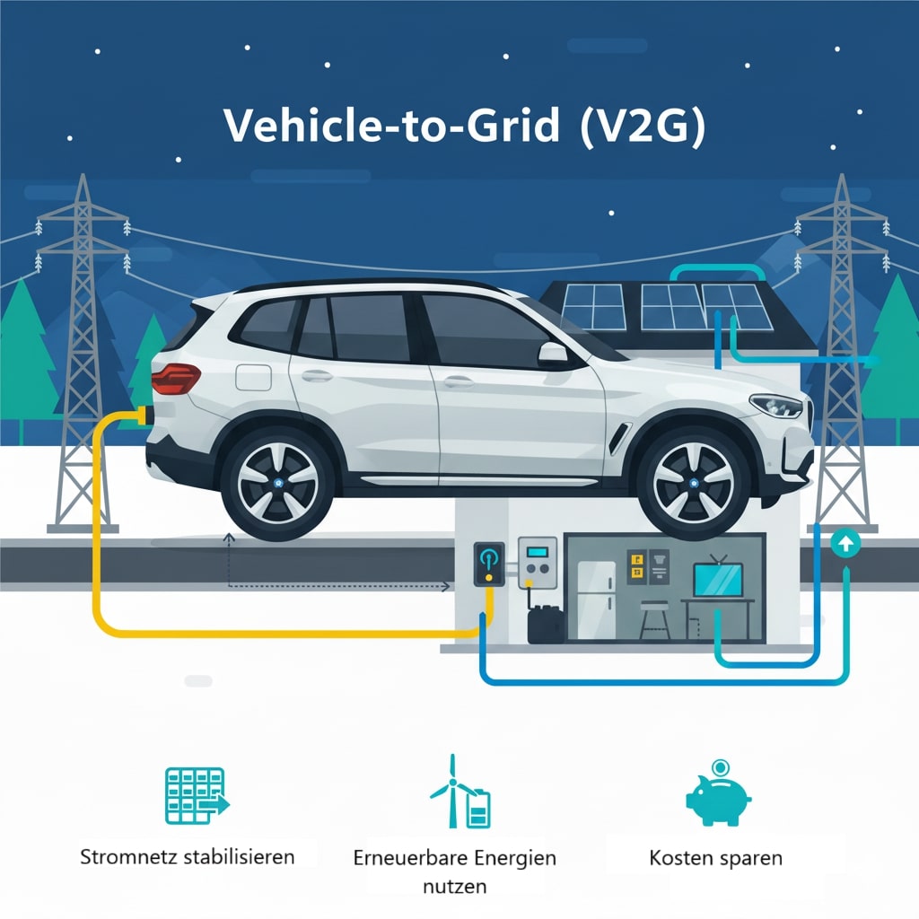 Vehicle-to-Grid (V2G): Das E-Auto fungiert als Netzstabilisator. Es gilt als die fortschrittlichste Form, bei der das Auto Strom direkt ins öffentliche Netz zurückspeist. So kann es Lastspitzen ausgleichen, indem es mittags überschüssigen Solarstrom aufnimmt und bei hoher Nachfrage wieder abgibt, was die Effizienz des gesamten Stromsystems steigert.