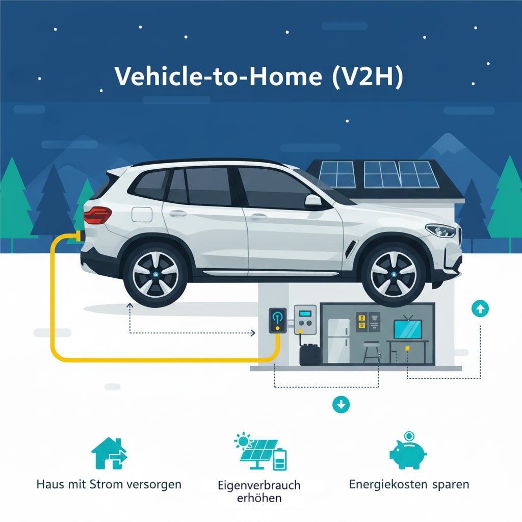 Vehicle-to-Home (V2H): Das E-Auto funktioniert wie ein Hausspeicher, indem es überschüssigen Solarstrom direkt ins Hausnetz einspeist. Besitzer von Photovoltaikanlagen können so tagsüber geladene Energie abends nutzen, ihre Abhängigkeit vom Stromversorger reduzieren und Energiekosten sparen.
