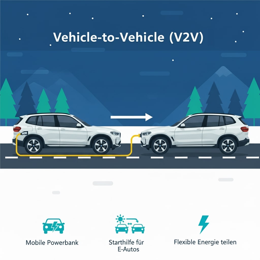 Vehicle-to-Vehicle (V2V): Dies bezeichnet den direkten Energietransfer von einem Elektroauto zu einem anderen, beispielsweise zur Pannenhilfe bei einer leeren Batterie. Der Energietransfer dient dazu, einem liegengebliebenen E-Auto mit leerer Batterie wieder genügend Ladung für die Weiterfahrt zu geben.