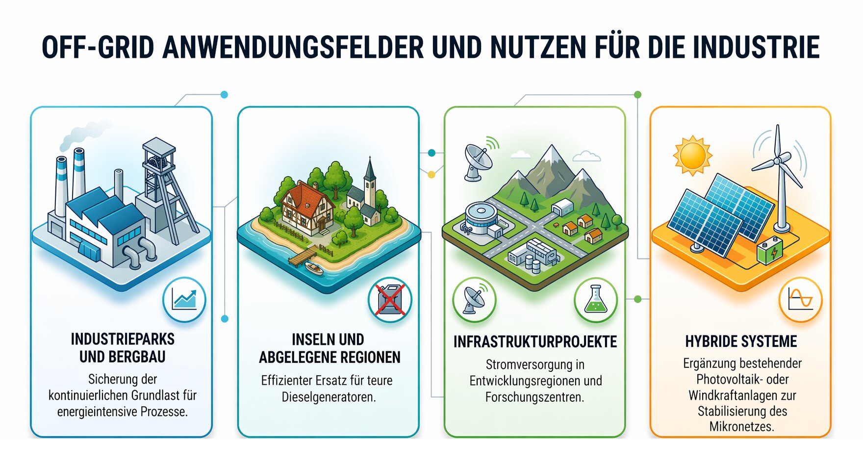 - Hybride Systeme: Ergänzung bestehender Photovoltaik- oder Windkraftanlagen zur Stabilisierung des Netzes.