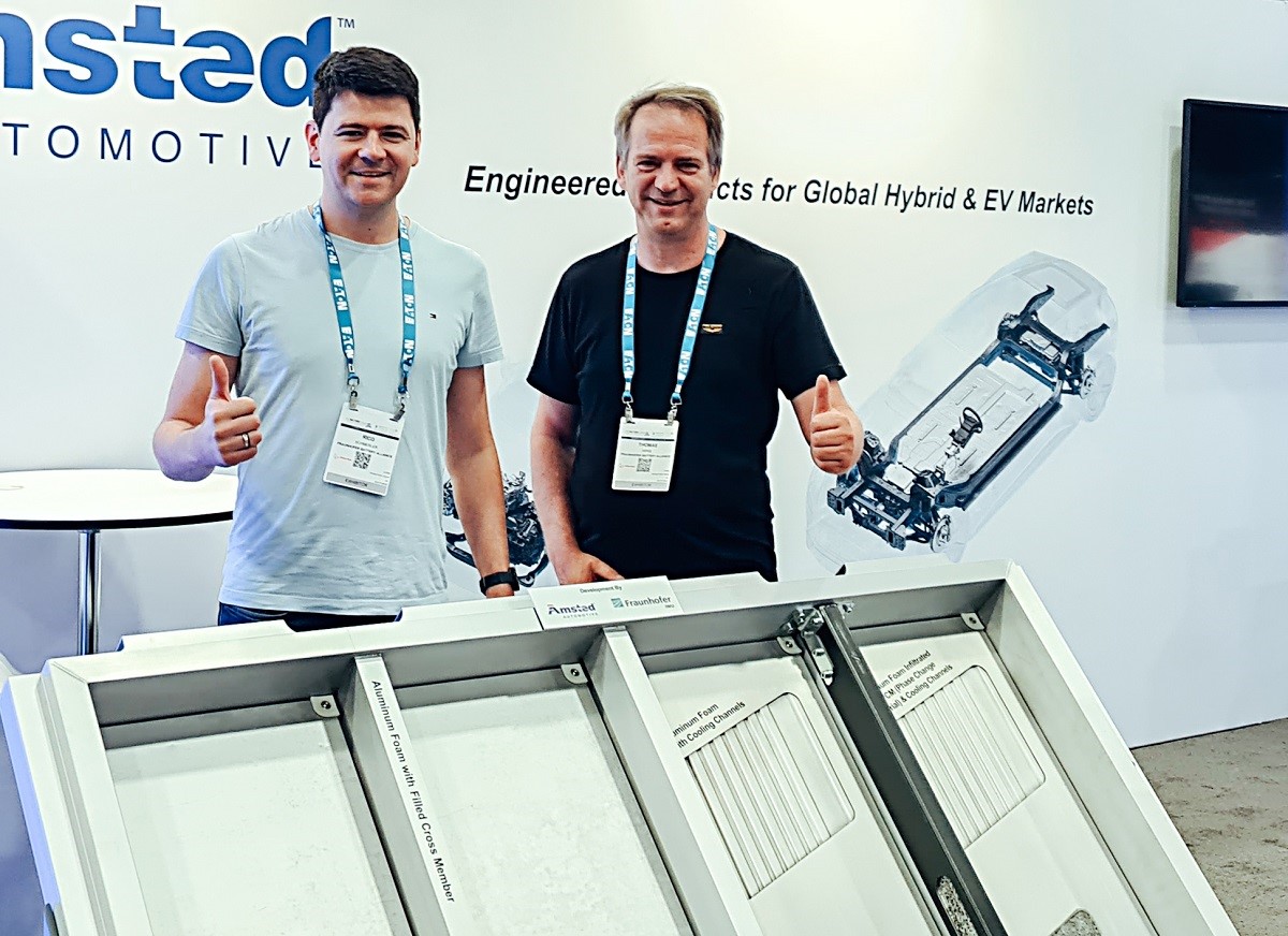 Das Fraunhofer IWU und der Automobilzulieferer Amsted Automotive präsentierten kürzlich auf der Battery Show North America in Detroit dieses innovative Batteriegehäusekonzept. Diese Materialstruktur aus Aluminiumschaum-Sandwiches (AAS) bestehen im inneren Kern aus Aluminiumschaum, der von zwei festen Aluminiumblechen umschlossen wird. Diese Konstruktion bietet entscheidende Vorteile für die Fahrzeugelektronik. Durch eine hohe Stoßfestigkeit gewährleistet sie für die empfindlichen Zellen einen guten Schutz vor mechanischen Einflüssen wie Steinen oder Streusalz. Darüber hinaus ist das Gehäuse in der Lage, bei Crashs Energie aufzunehmen und Kurzschlüsse zu verhindern. Zudem ist das Gehäuse passgenau für den Unterboden des Fahrzeugs konzipiert und trägt zur Steifigkeit der gesamten Karosserie bei. Ferner erhöht das niedrige Eigengewicht des Batteriegehäuses die Reichweite des Fahrzeugs.