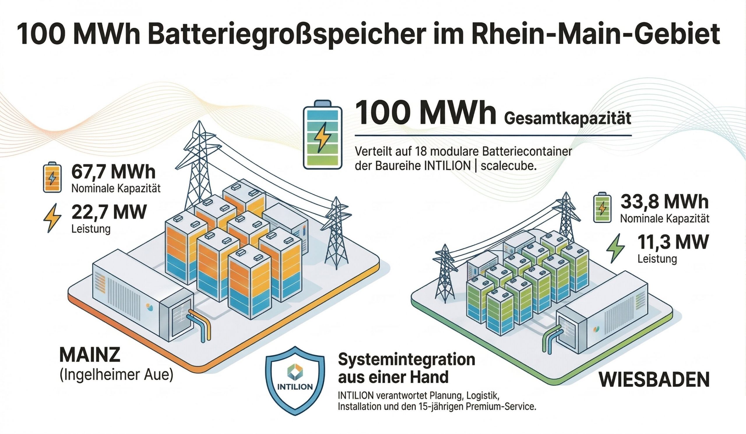 Technisch basieren beide Anlagen auf der modularen Baureihe INTILION | scalecube. Insgesamt werden 18 Batteriecontainer installiert, wobei jede Einheit über eine Kapazität von 5,6 MWh verfügt. INTILION übernimmt bei beiden Projekten als Systemintegrator die Gesamtverantwortung für Planung und Realisierung der Batterieanlagen. Das Leistungsspektrum des Unternehmens ist dabei breit gefächert und deckt den gesamten Prozess bis zum dauerhaften Betrieb ab.