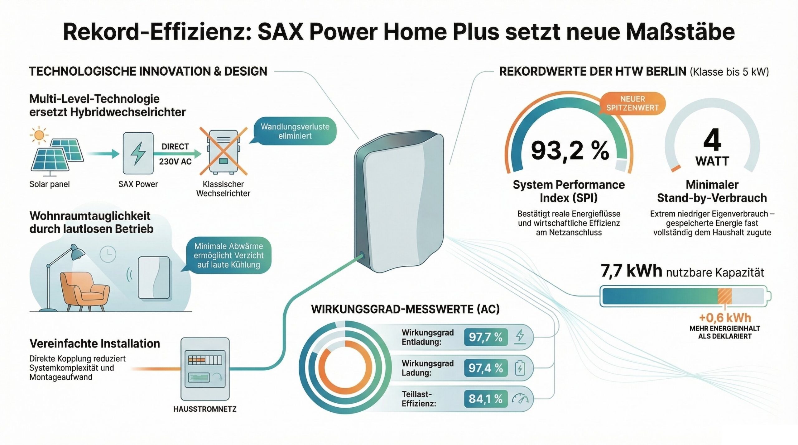 Die Forschungsgruppe Solarspeichersysteme der HTW Berlin hat in der Stromspeicher-Inspektion 2026 einen neuen Spitzenreiter in der Klasse bis 5 kW ermittelt. Das System Home Plus von SAX Power erreichte einen System Performance Index (SPI) von 93,2% und setzt damit einen neuen Rekordwert für diese Leistungsklasse. Die Besonderheit liegt in der verwendeten Multi-Level-Technologie, die ohne klassischen Hybridwechselrichter auskommt und die Zellspannung direkt in 230 Volt Wechselspannung wandelt. Neben hohen Wirkungsgraden überzeugte der Speicher im Test durch einen geringen Stand-by-Verbrauch von 4 Watt und hohe Kapazität. Diese war sogar höher als im Datenblatt von SAX Power angegeben.