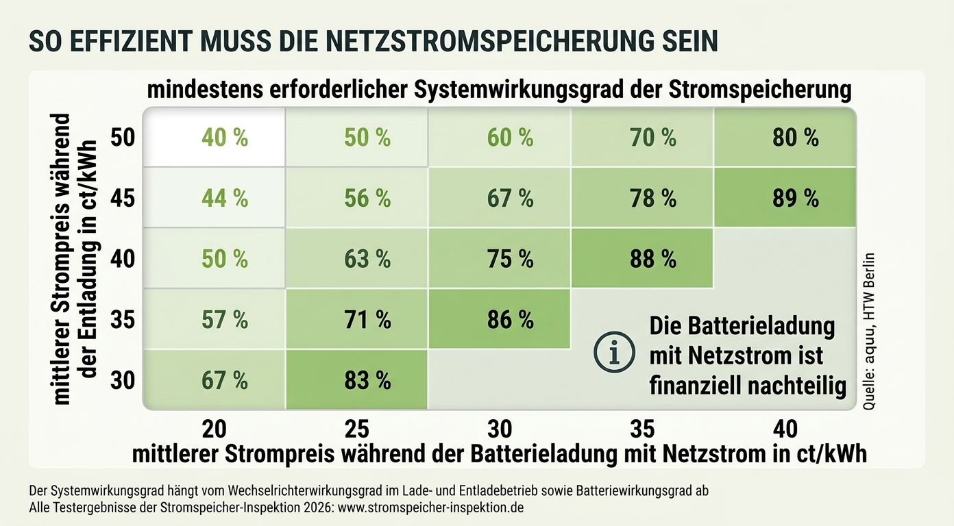 Ein Beispiel: Bezieht ein Haushalt in einer moderaten Niedrigpreisphase Netzstrom für 30 ct/kWh und möchte diesen in einer Hochpreisphase von 40 ct/kWh nutzen, muss der Systemwirkungsgrad bereits 75% betragen, um die Kosten des direkten Netzbezugs lediglich auszugleichen. Sinkt der Preisvorteil weiter – etwa bei einem Ladevorgang für 35 ct/kWh und einer Entladung für 40 ct/kWh – steigt die erforderliche Effizienz auf 88% an. Da viele Systeme insbesondere im Teillastbereich deutlich höhere Verluste aufweisen, führen solche geringen Preisdifferenzen ohne hocheffiziente Technik oft zu einem finanziellen Verlustgeschäft für den Anlagenbetreiber.